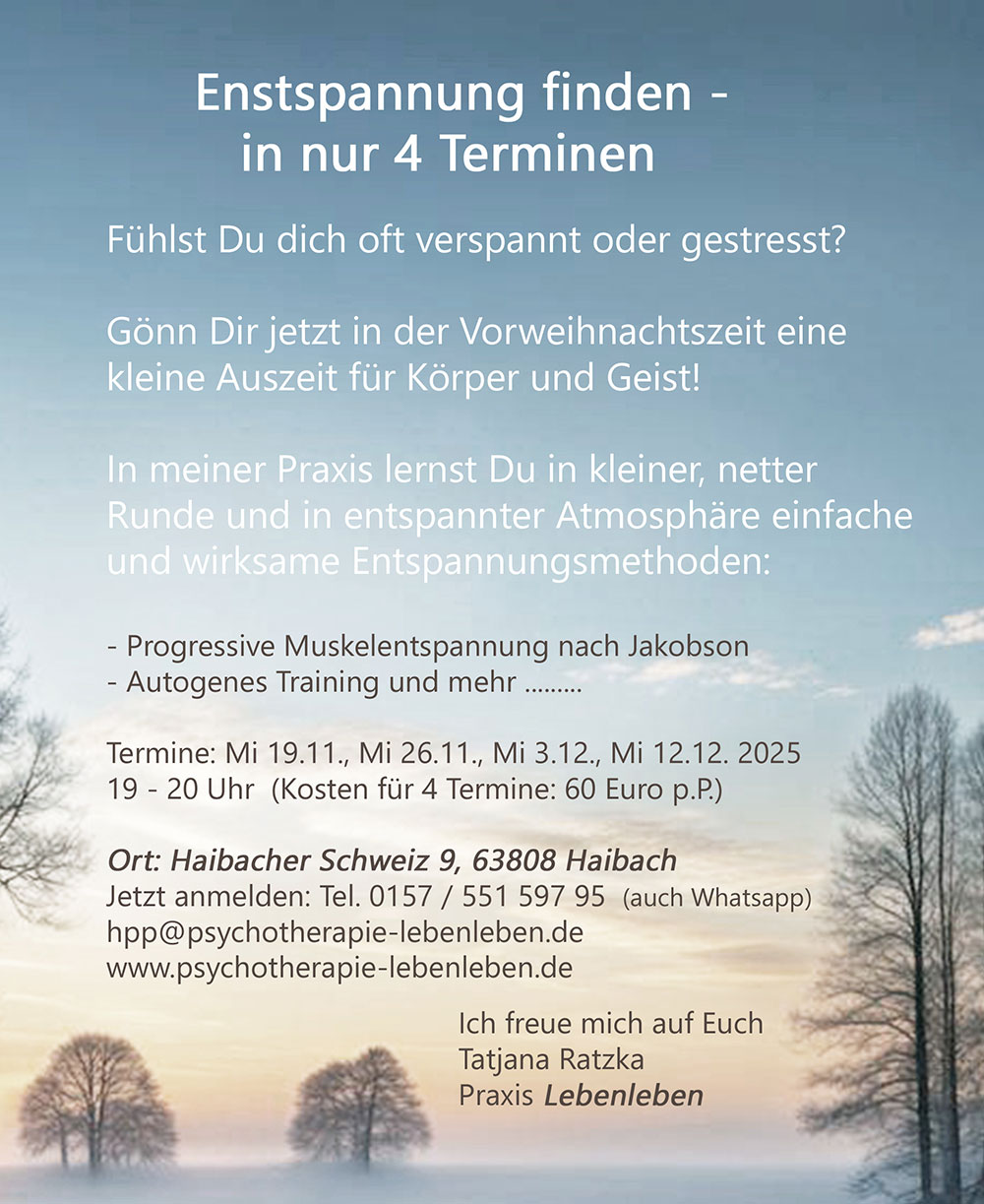 Gönn Dir jetzt in der Vorweihnachtszeit eine kleine Auszeit für Körper und Geist! In meiner Praxis lernst Du in kleiner, netter Runde und in entspannter Atmosphäre einfache und wirksame Entspannungsmethoden: